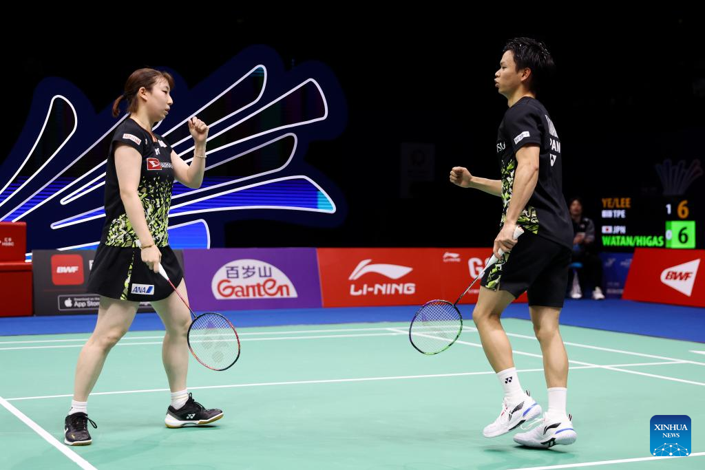 Watanabe Yuta (R)/Higashino Arisa of Japan react during the mixed doubles first round match against Ye Hong Wei/Lee Chia Hsin of Chinese Taipei at China Masters Badminton Tournament 2023 in Shenzhen, south China's Guangdong Province, Nov. 22, 2023. (Photo by Wu Zhizhao/Xinhua)