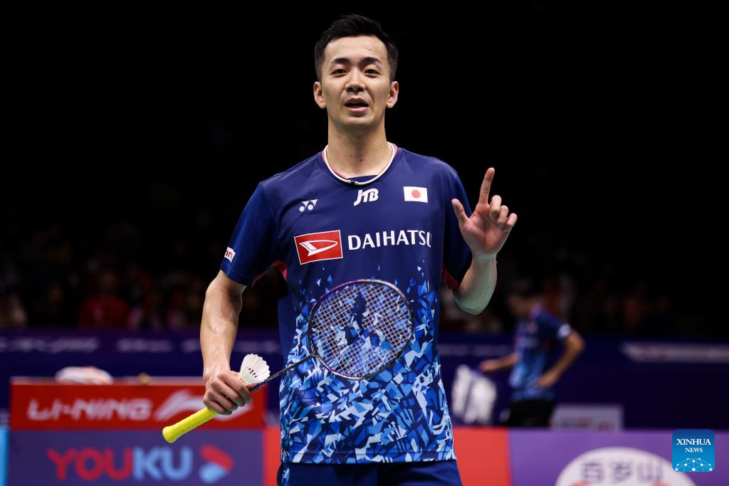 Nishimoto Kenta of Japan celebrates after winning the men's singles first round match against Priyanshu Rajawat of India at China Masters Badminton Tournament 2023 in Shenzhen, south China's Guangdong Province, Nov. 22, 2023. (Photo by Wu Zhizhao/Xinhua)