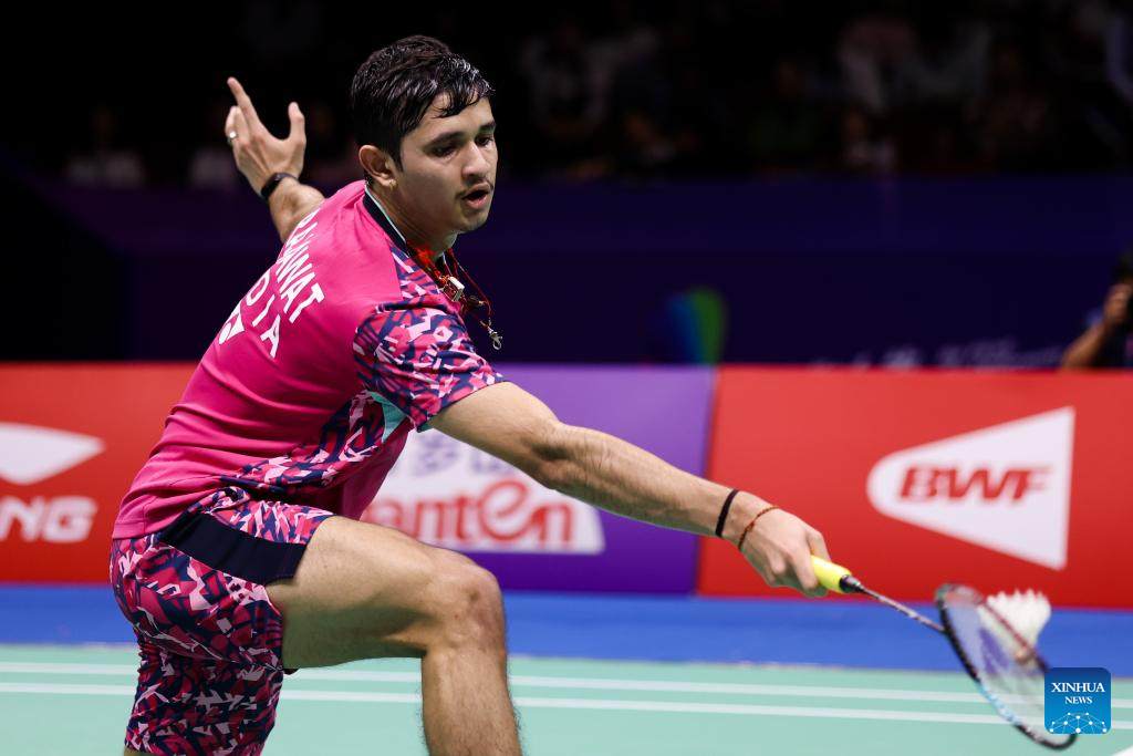 Priyanshu Rajawat of India hits a return during the men's singles first round match against Nishimoto Kenta of Japan at China Masters Badminton Tournament 2023 in Shenzhen, south China's Guangdong Province, Nov. 22, 2023. (Photo by Wu Zhizhao/Xinhua)