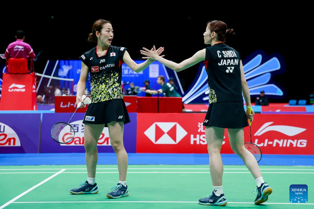 Matsuyama Nami (L)/Shida Chiharu of Japan react during the women's doubles first round match against Jongkolphan Kititharakul/Rawinda Prajongjai of Thailand at China Masters Badminton Tournament 2023 in Shenzhen, south China's Guangdong Province, Nov. 22, 2023. (Photo by Peng Zhigang/Xinhua)