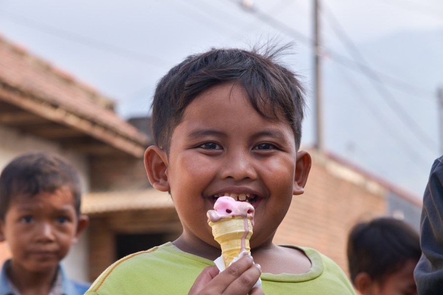 A boy enjoys an Aice ice cream in Mojokerto, East Java, Indonesia, Sept. 14, 2023. (Xinhua/Xu Qin)