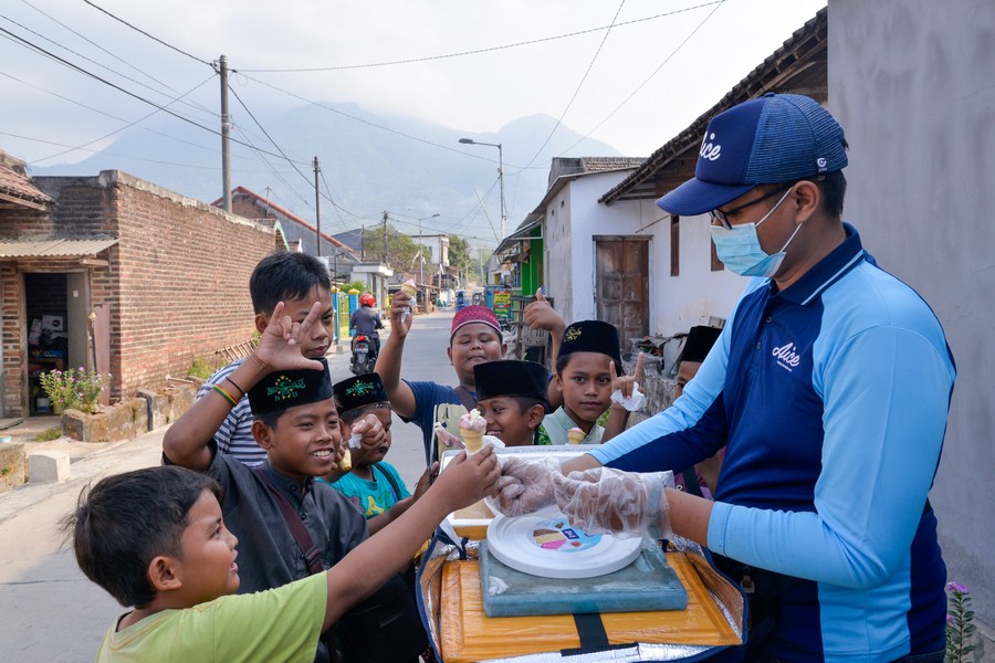 Children buy Aice ice cream from Yusuf Afat's Aice ice cream sales bicycle in Mojokerto, East Java, Indonesia, Sept. 14, 2023. (Xinhua/Xu Qin)