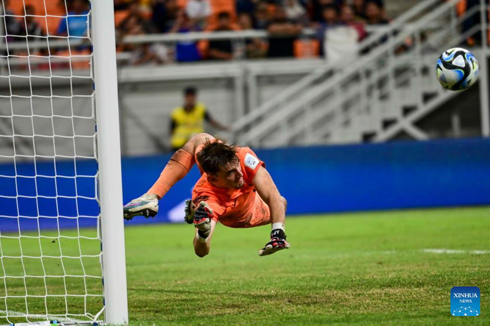 Goalkeeper Paul Argney of France makes a save during the round of 16 match of the FIFA U-17 World Cup Indonesia 2023 between France and Senegal at The Jakarta International Stadium in Jakarta, Indonesia, Nov. 22, 2023. (Xinhua/Zulkarnain)