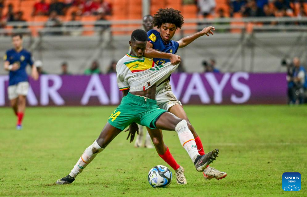 Tidiane Diallo (R) of France vies with Pierre Dorival of Senegal during the round of 16 match of the FIFA U-17 World Cup Indonesia 2023 between France and Senegal at The Jakarta International Stadium in Jakarta, Indonesia, Nov. 22, 2023. (Xinhua/Zulkarnain)
