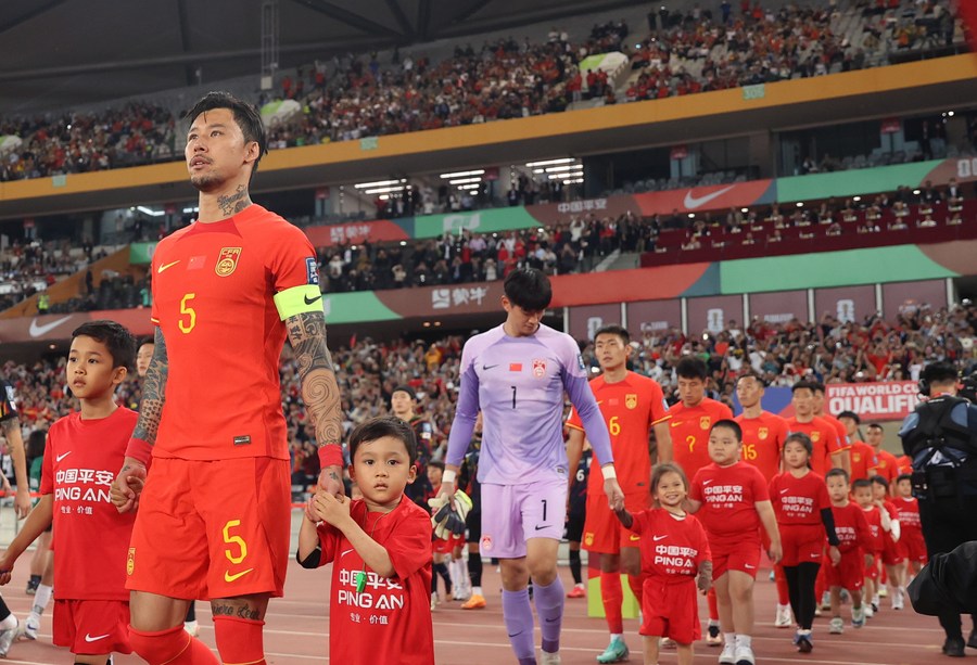 China's players enter the stadium before the World Cup Asian qualifying Group C match against South Korea in Shenzhen. (Xinhua/Jia Haocheng)