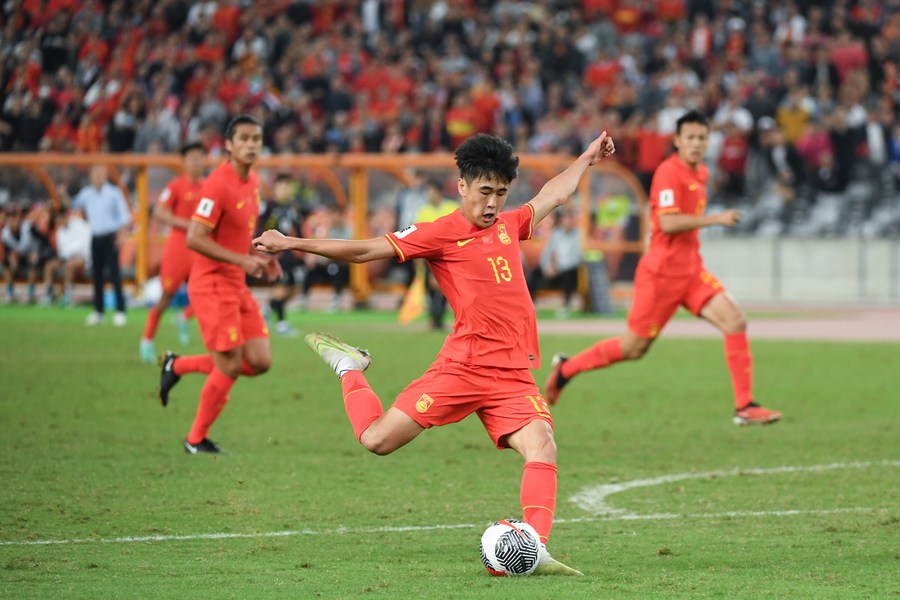 Dai Weijun of China shoots during the World Cup Asian qualifying Group C match against South Korea in Shenzhen. (Xinhua/Liang Xu)