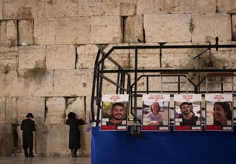Posts of Israeli hostages held in the Gaza Strip are pictured at the Western Wall in the Old City of Jerusalem on Nov. 7, 2023. (Xinhua/Chen Junqing)