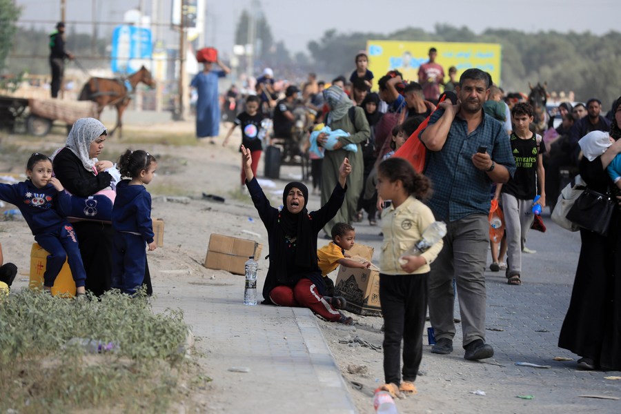 Palestinian people are seen on their way from Gaza City toward south, in central Gaza Strip, on Nov. 10, 2023. (Photo by Yasser Qudih/Xinhua)