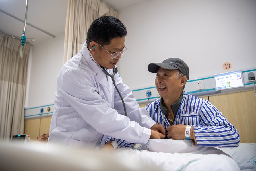 A medical worker talks with a patient at the transition ward of the Chongqing affiliate of Jiangsu Provincial Hospital in Qijiang District, southwest China's Chongqing Municipality, Oct. 12, 2023. (Xinhua/Tang Yi)