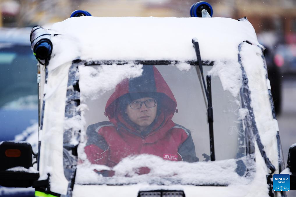 A delivery man drives in snow in Harbin, northeast China's Heilongjiang Province, Nov. 23, 2023. (Xinhua/Wang Jianwei)