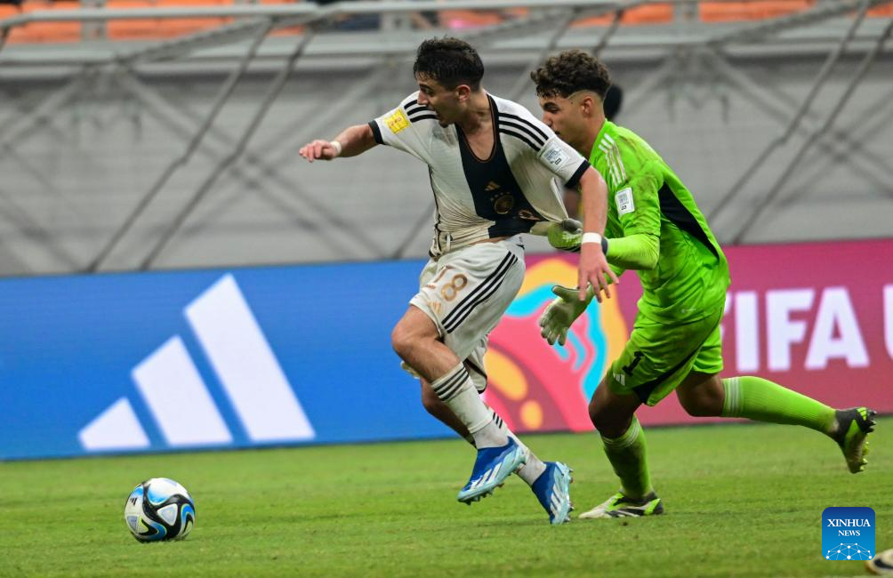 Paris Brunner of Germany celebrates after scoring during the quarterfinal match of the FIFA U-17 World Cup Indonesia 2023 between Spain and Germany at The Jakarta International Stadium in Jakarta, Indonesia, Nov. 24, 2023. (Xinhua/Zulkarnain)