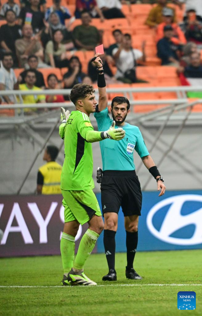 Spain's goalkeeper Raul Jimenez (L) receives a red card during the quarterfinal match of the FIFA U-17 World Cup Indonesia 2023 between Spain and Germany at The Jakarta International Stadium in Jakarta, Indonesia, Nov. 24, 2023. (Xinhua/Zulkarnain)