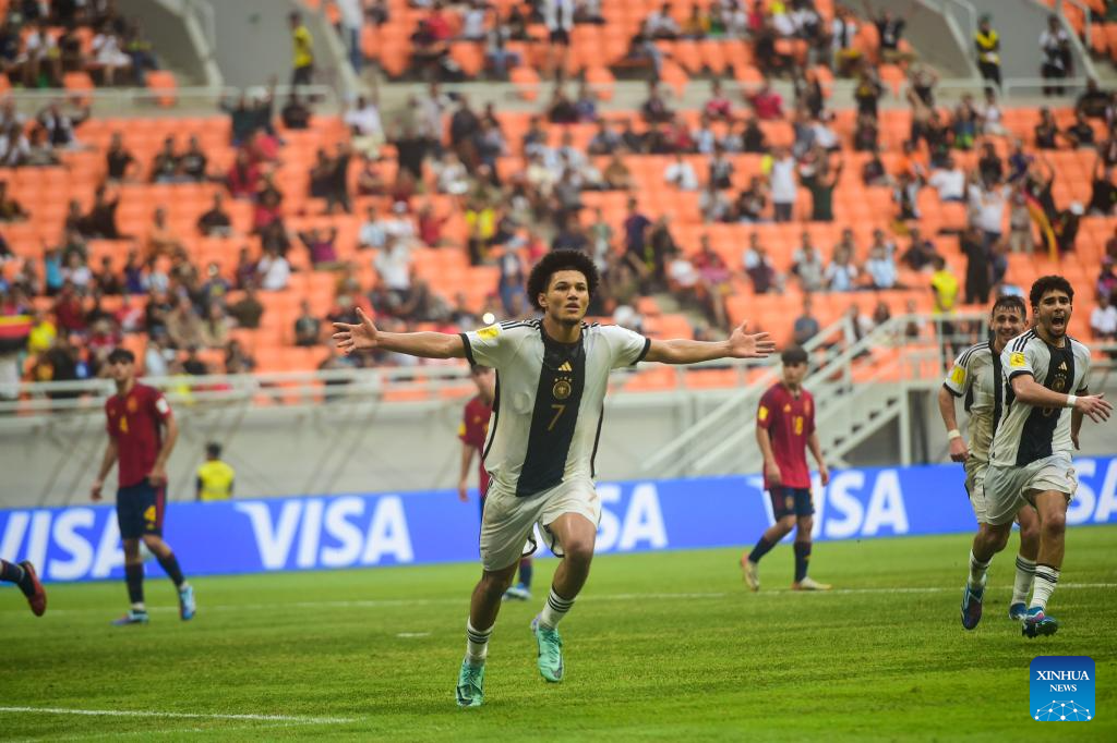 Paris Brunner (R) of Germany celebrates after scoring during the quarterfinal match of the FIFA U-17 World Cup Indonesia 2023 between Spain and Germany at The Jakarta International Stadium in Jakarta, Indonesia, Nov. 24, 2023. (Xinhua/Zulkarnain)