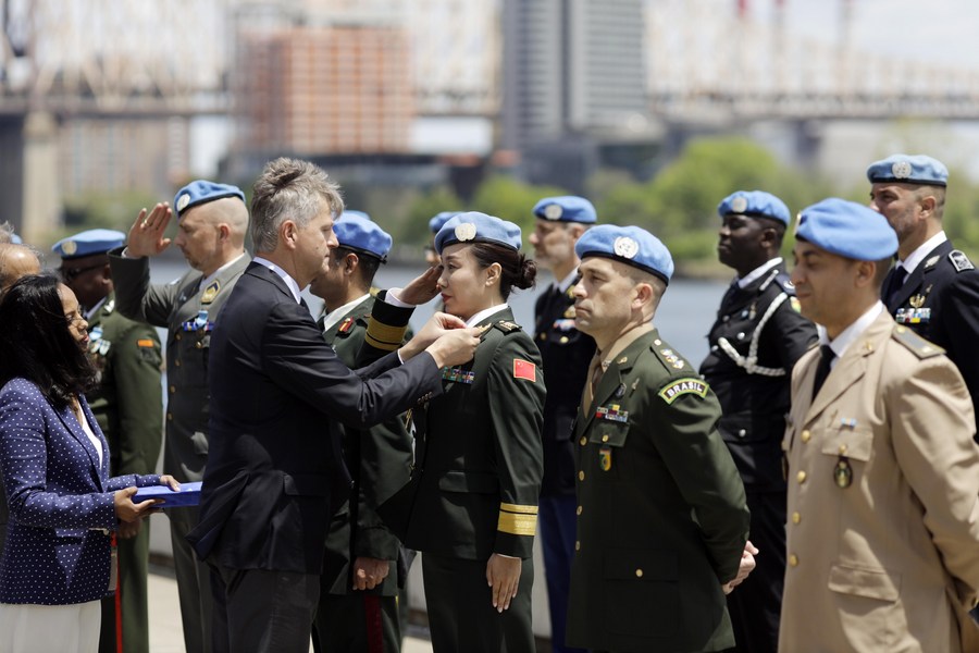 Colonel Zhang Qiman (3rd R, front) from China is awarded the United Nations Peacekeeping Medal at the UN headquarters in New York, May 24, 2019. Two Chinese military officers on Friday were awarded together with 28 others the United Nations Peacekeeping Medal for their contributions to the UN peacekeeping effort. Colonel Zhang Qiman and lieutenant colonel Duanmu Donglin, currently working at the UN Department of Peace Operations (DPO), were recipients of the medal, which was presented to them by Jean-Pierre Lacroix, undersecretary-general for the DPO. (Xinhua/Li Muzi)