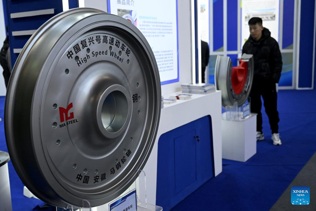 This photo taken on Nov. 24, 2023 shows a model of high speed wheel for the Fuxing high-speed train series at the 3rd International New Materials Industry Conference in Bengbu, east China's Anhui Province. The event kicked off in Anhui's Bengbu on Friday, featuring exhibitions, forums, seminars and trade fairs in the new materials industry. (Xinhua/Huang Bohan)
