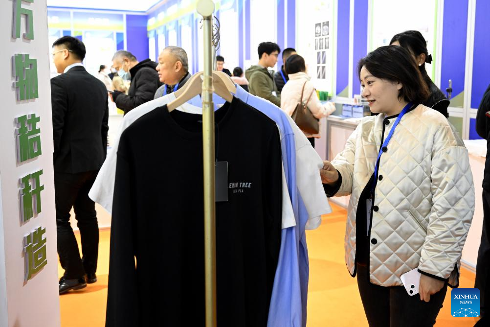 Visitors look at clothes made from straw at the 3rd International New Materials Industry Conference in Bengbu, east China's Anhui Province, Nov. 24, 2023. The event kicked off in Anhui's Bengbu on Friday, featuring exhibitions, forums, seminars and trade fairs in the new materials industry. (Xinhua/Huang Bohan)