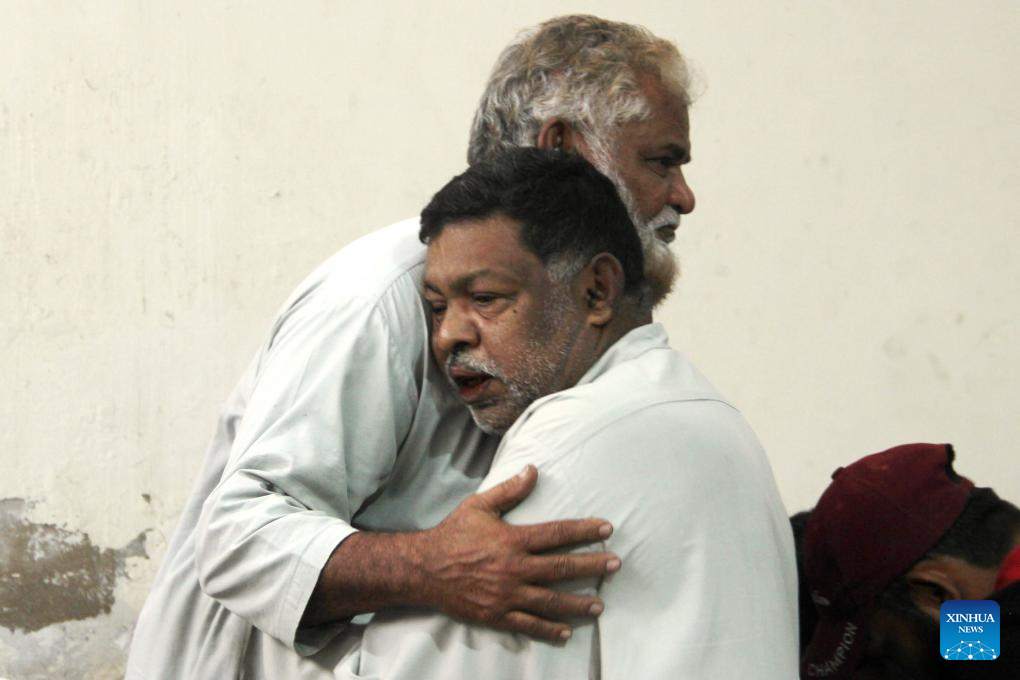 People mourn for a victim of shopping mall fire at a hospital in southern Pakistani port city of Karachi on Nov. 25, 2023. At least eight people were killed and several others injured when a fire erupted in a shopping mall in Pakistan's southern port city of Karachi of Sindh province on Saturday, government officials said. (Str/Xinhua)