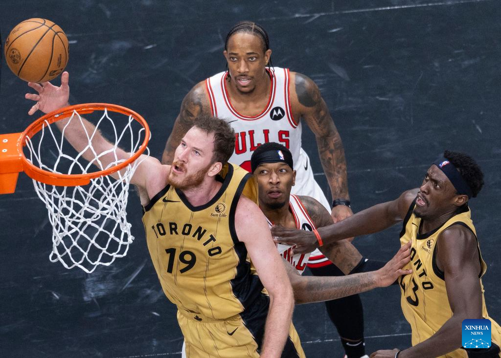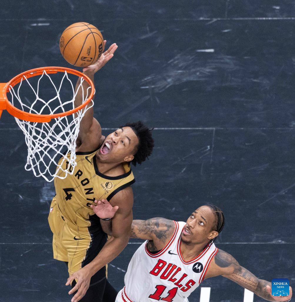 Jakob Poeltl (L) of Toronto Raptors makes a layup during the 2023-2024 NBA In-Season Tournament game between Toronto Raptors and Chicago Bulls in Toronto, Canada, on Nov. 24, 2023. (Photo by Zou Zheng/Xinhua)
