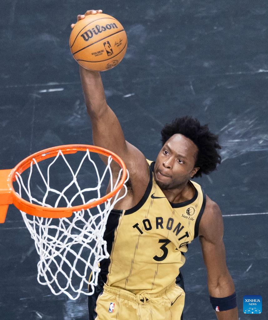 O.G. Anunoby of Toronto Raptors dunks during the 2023-2024 NBA In-Season Tournament game between Toronto Raptors and Chicago Bulls in Toronto, Canada, on Nov. 24, 2023. (Photo by Zou Zheng/Xinhua)