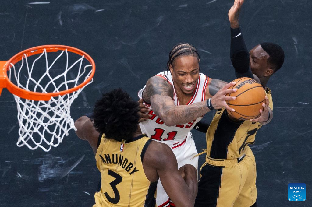DeMar DeRozan (C) of Chicago Bulls breaks through during the 2023-2024 NBA In-Season Tournament game between Toronto Raptors and Chicago Bulls in Toronto, Canada, on Nov. 24, 2023. (Photo by Zou Zheng/Xinhua)