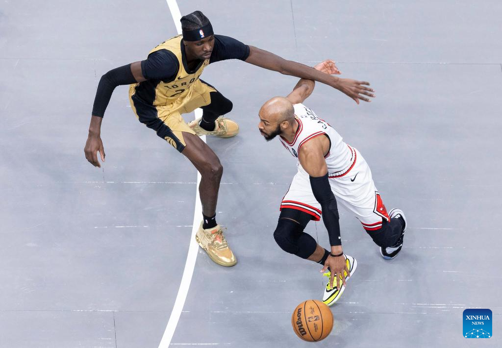 Jevon Carter (R) of Chicago Bulls drives the ball during the 2023-2024 NBA In-Season Tournament game between Toronto Raptors and Chicago Bulls in Toronto, Canada, on Nov. 24, 2023. (Photo by Zou Zheng/Xinhua)