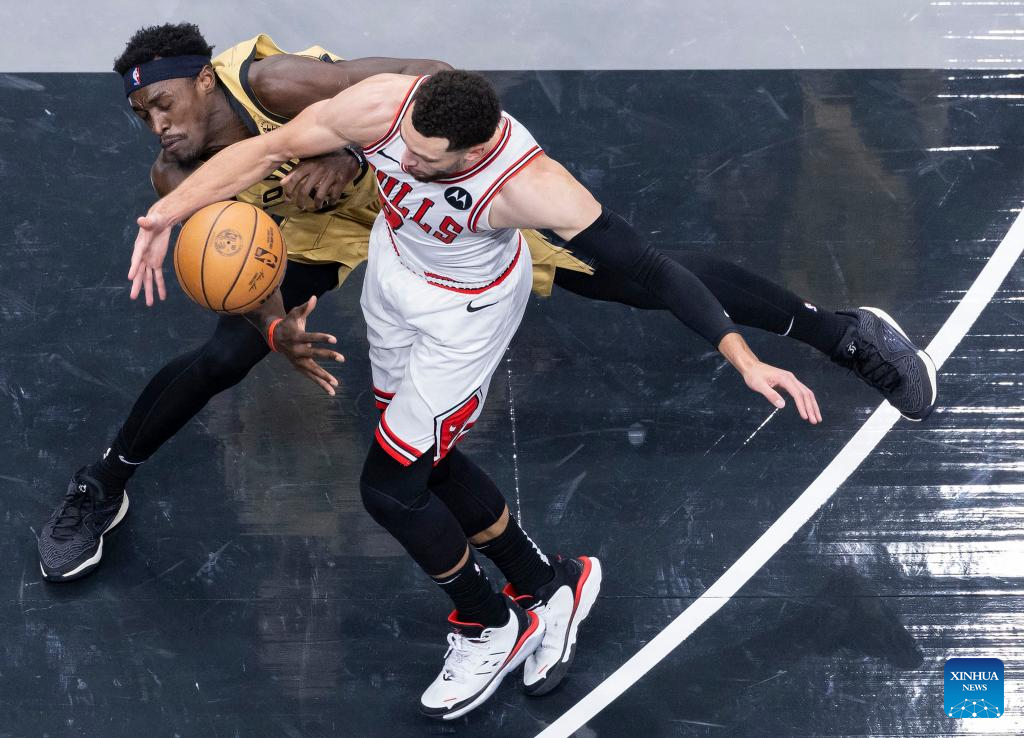 Zach LaVine (L) of Chicago Bulls fights for a rebound with Scottie Barnes of Toronto Raptors during the 2023-2024 NBA In-Season Tournament game between Toronto Raptors and Chicago Bulls in Toronto, Canada, on Nov. 24, 2023. (Photo by Zou Zheng/Xinhua)