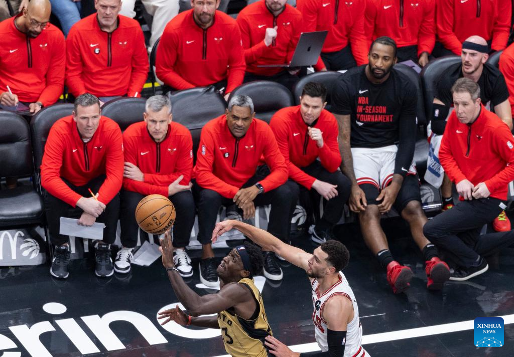 Zach LaVine (front R) of Chicago Bulls vies with Pascal Siakam of Toronto Raptors during the 2023-2024 NBA In-Season Tournament game between Toronto Raptors and Chicago Bulls in Toronto, Canada, on Nov. 24, 2023. (Photo by Zou Zheng/Xinhua)