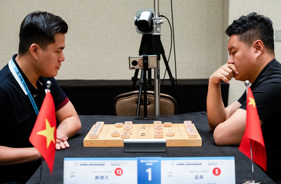 Meng Chen of China (R) competes against Lai Ly Huynh of Vietnam during the men's individual round 9 match at the 18th World Xiangqi Championship in Houston, Texas, the United States, on Nov. 24, 2023. (Photo by Chen Chen/Xinhua)