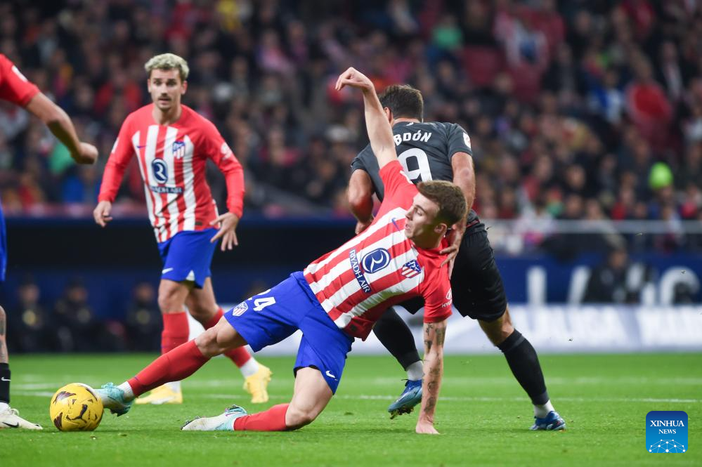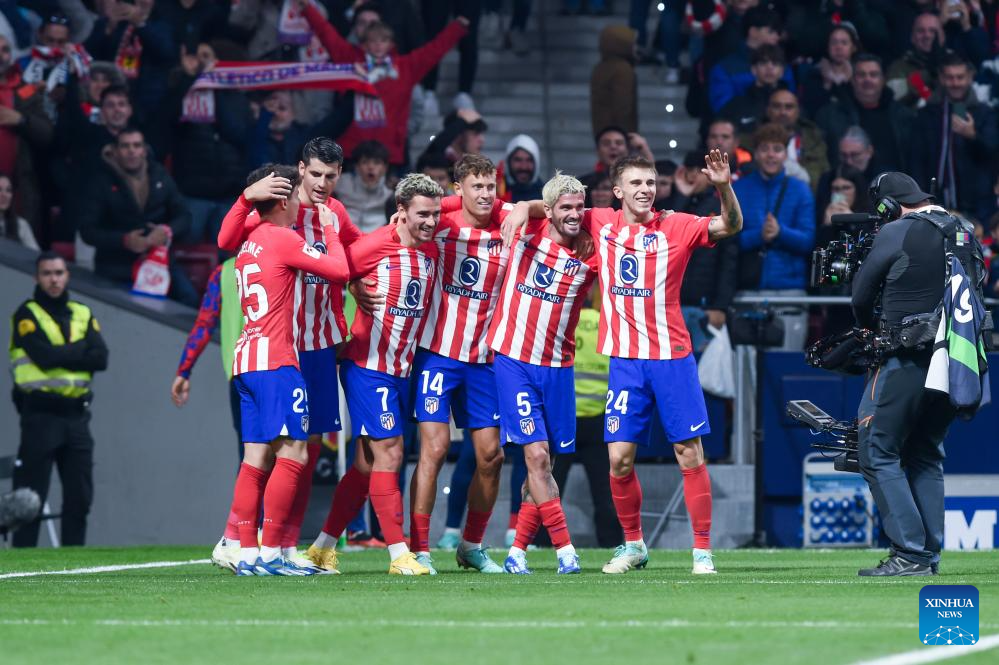 Players of Atletico de Madrid celebrate a goal during a La Liga football match between Atletico de Madrid and RCD Mallorca in Madrid, Spain, Nov. 25, 2023. (Photo by Gustavo Valiente/Xinhua)