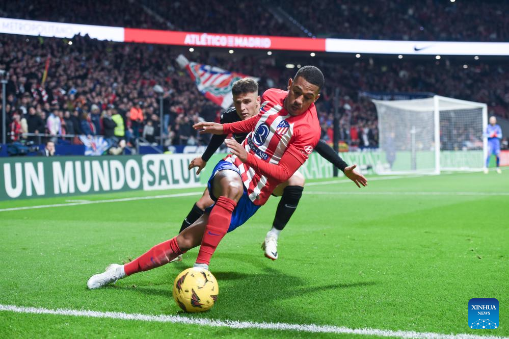 Samuel Lino (front) of Atletico de Madrid breaks through during a La Liga football match between Atletico de Madrid and RCD Mallorca in Madrid, Spain, Nov. 25, 2023. (Photo by Gustavo Valiente/Xinhua)
