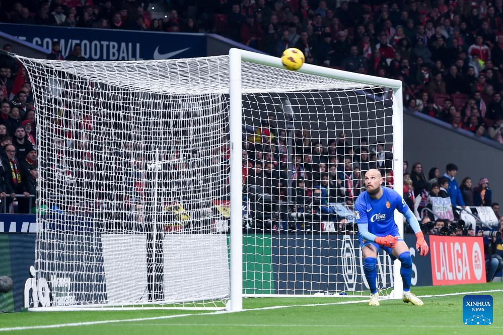 Predrag Rajkovic, goalkeeper of Mallorca, fails to save a goal during a La Liga football match between Atletico de Madrid and RCD Mallorca in Madrid, Spain, Nov. 25, 2023. (Photo by Gustavo Valiente/Xinhua)