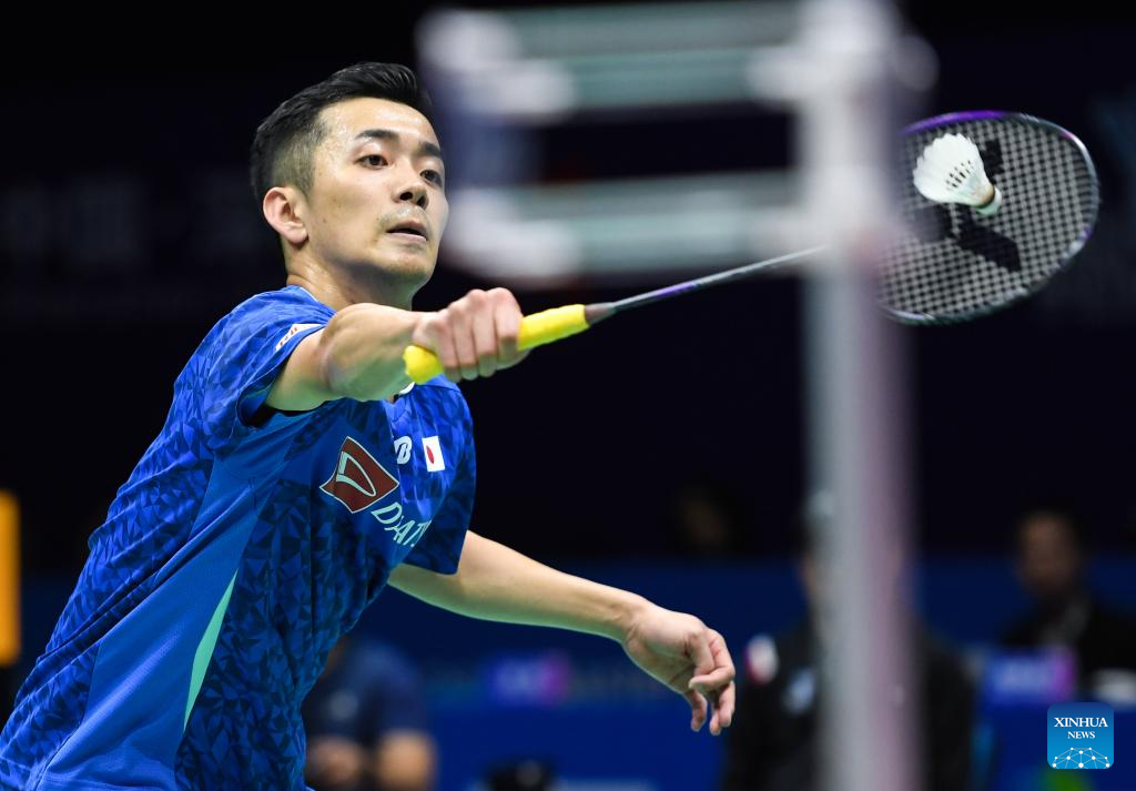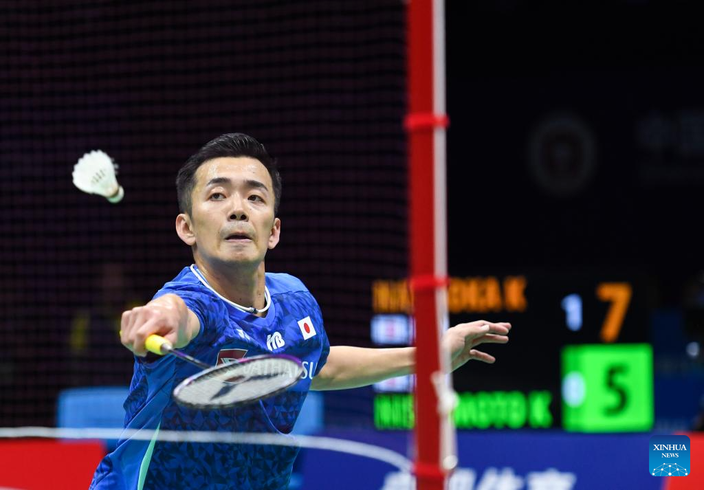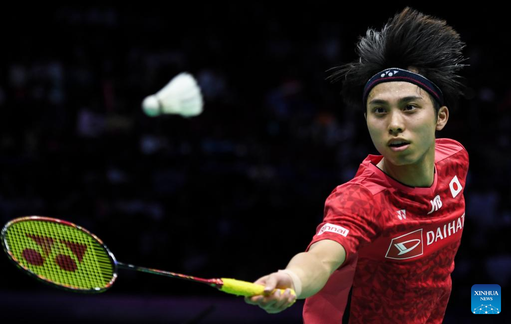 Japan's Nishimoto Kenta hits a return during the men's singles final against his compatriot Naraoka Kodai at the China Masters Badminton Tournament 2023 in Shenzhen, south China's Guangdong Province, Nov. 26, 2023. (Xinhua/Mao Siqian)