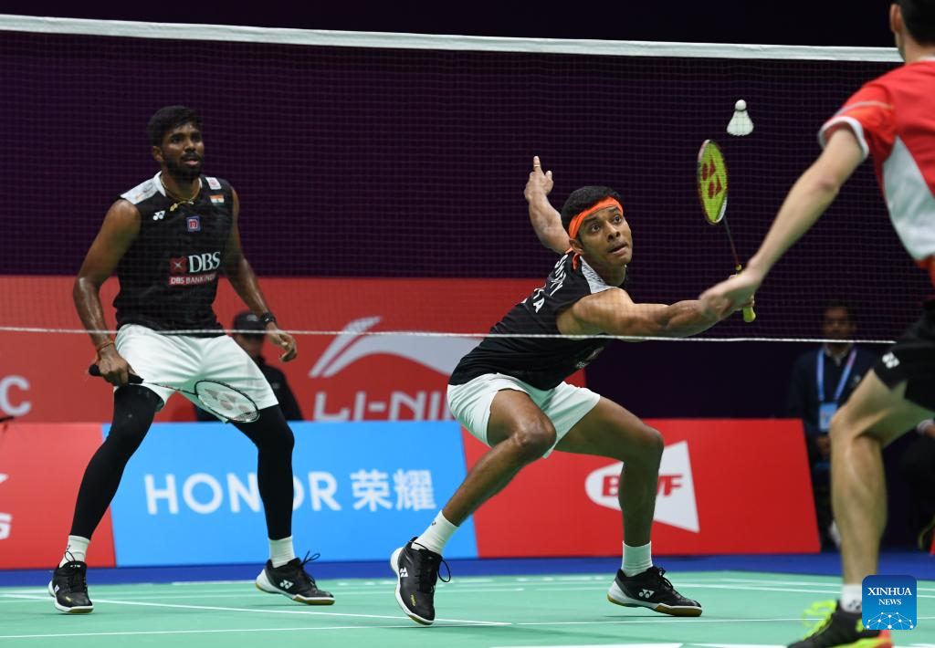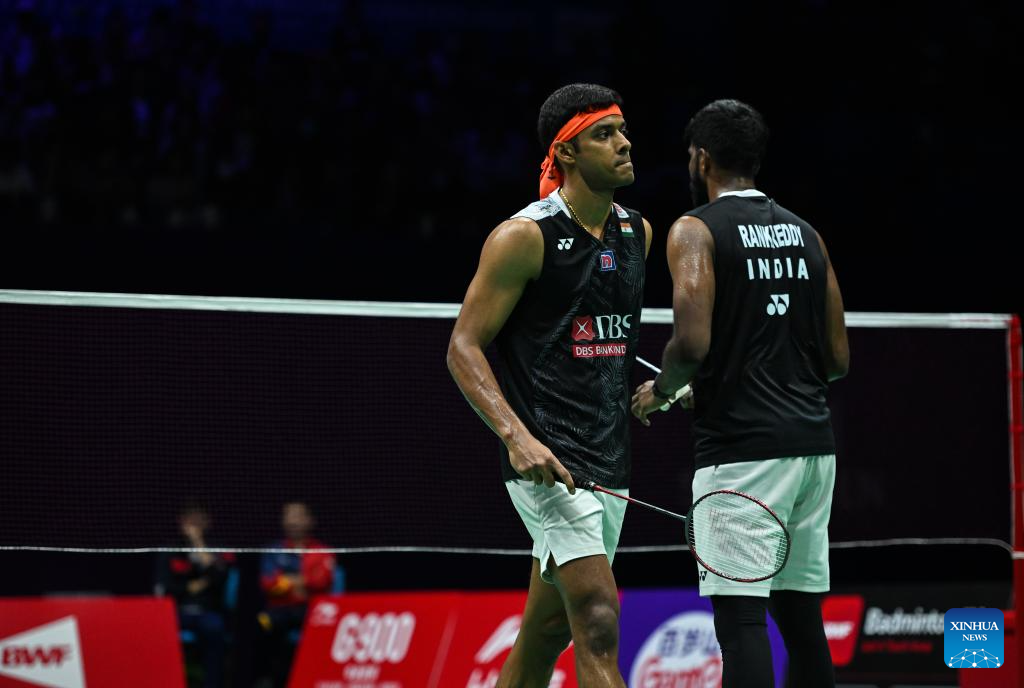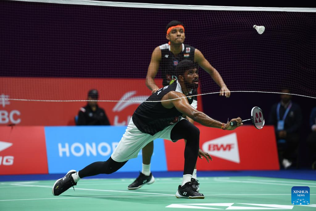 Chirag Shetty (R)/Satwiksairaj Rankireddy of India compete during the men's doubles final against Liang Weikeng/Wang Chang of China at the China Masters Badminton Tournament 2023 in Shenzhen, south China's Guangdong Province, Nov. 26, 2023. (Xinhua/Mao Siqian)