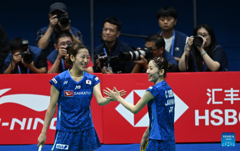 Matsuyama Nami (R)/Shida Chiharu of Japan celebrate winning the women's doubles final against their compatriots Fukushima Yuki/Hirota Sayaka at the China Masters Badminton Tournament 2023 in Shenzhen, south China's Guangdong Province, Nov. 26, 2023. (Photo by Peng Zhigang/Xinhua)