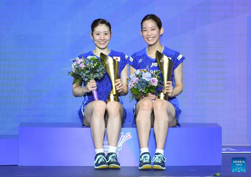 Winners Matsuyama Nami (R)/Shida Chiharu of Japan pose for photos during the awarding ceremony of women's doubles at the China Masters Badminton Tournament 2023 in Shenzhen, south China's Guangdong Province, Nov. 26, 2023. (Xinhua/Mao Siqian)