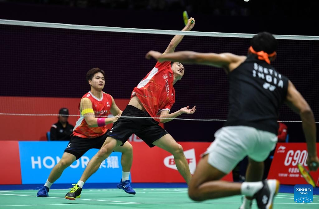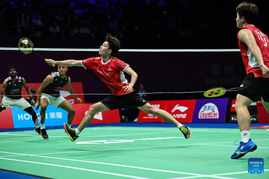 Chirag Shetty/Satwiksairaj Rankireddy (R) of India compete during the men's doubles final against Liang Weikeng/Wang Chang of China at the China Masters Badminton Tournament 2023 in Shenzhen, south China's Guangdong Province, Nov. 26, 2023. (Xinhua/Mao Siqian)