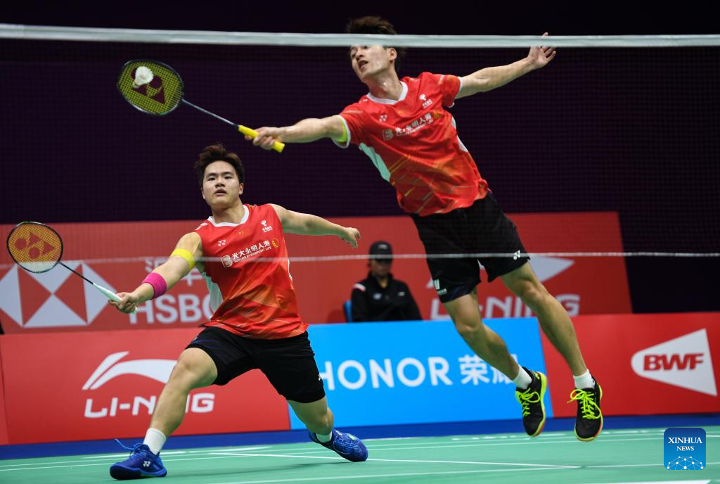 Liang Weikeng (L)/Wang Chang of China compete during the men's doubles final against Chirag Shetty/Satwiksairaj Rankireddy of India at the China Masters Badminton Tournament 2023 in Shenzhen, south China's Guangdong Province, Nov. 26, 2023. (Xinhua/Mao Siqian)