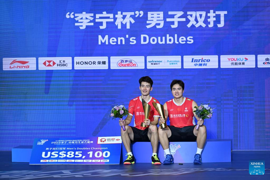 Winners Liang Weikeng (R)/Wang Chang of China pose during the awarding ceremony for the men's doubles event at the China Masters Badminton Tournament 2023 in Shenzhen, south China's Guangdong Province, Nov. 26, 2023. (Xinhua/Mao Siqian)