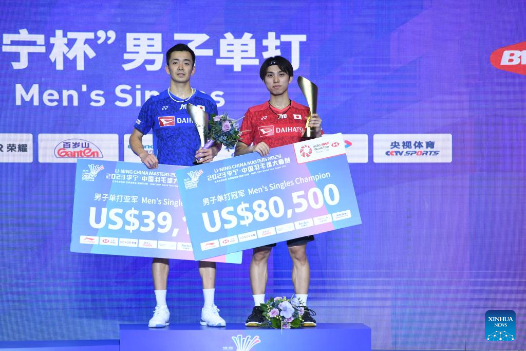 Winner Japan's Naraoka Kodai (R) poses with his compatriot runner-up Nishimoto Kenta during the awarding ceremony for men's singles event at the China Masters Badminton Tournament 2023 in Shenzhen, south China's Guangdong Province, Nov. 26, 2023. (Xinhua/Mao Siqian)