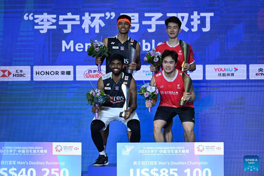 Winners Liang Weikeng (front R)/Wang Chang (back R) of China pose with runners-up Chirag Shetty (back L)/Satwiksairaj Rankireddy of India during the awarding ceremony for the men's doubles event at the China Masters Badminton Tournament 2023 in Shenzhen, south China's Guangdong Province, Nov. 26, 2023. (Xinhua/Mao Siqian)