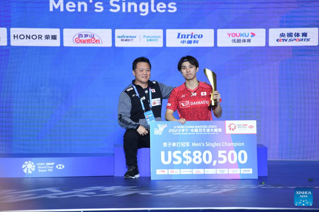 Winner Japan's Naraoka Kodai (R) poses with his father Naraoka Hiroshi during the awarding ceremony for men's singles event at the China Masters Badminton Tournament 2023 in Shenzhen, south China's Guangdong Province, Nov. 26, 2023. (Xinhua/Mao Siqian)