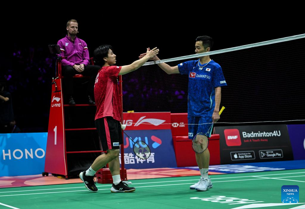 Japan's Naraoka Kodai (L) and his compatriot Nishimoto Kenta gesture to spectators after their men's singles final at the China Masters Badminton Tournament 2023 in Shenzhen, south China's Guangdong Province, Nov. 26, 2023. (Xinhua/Mao Siqian)