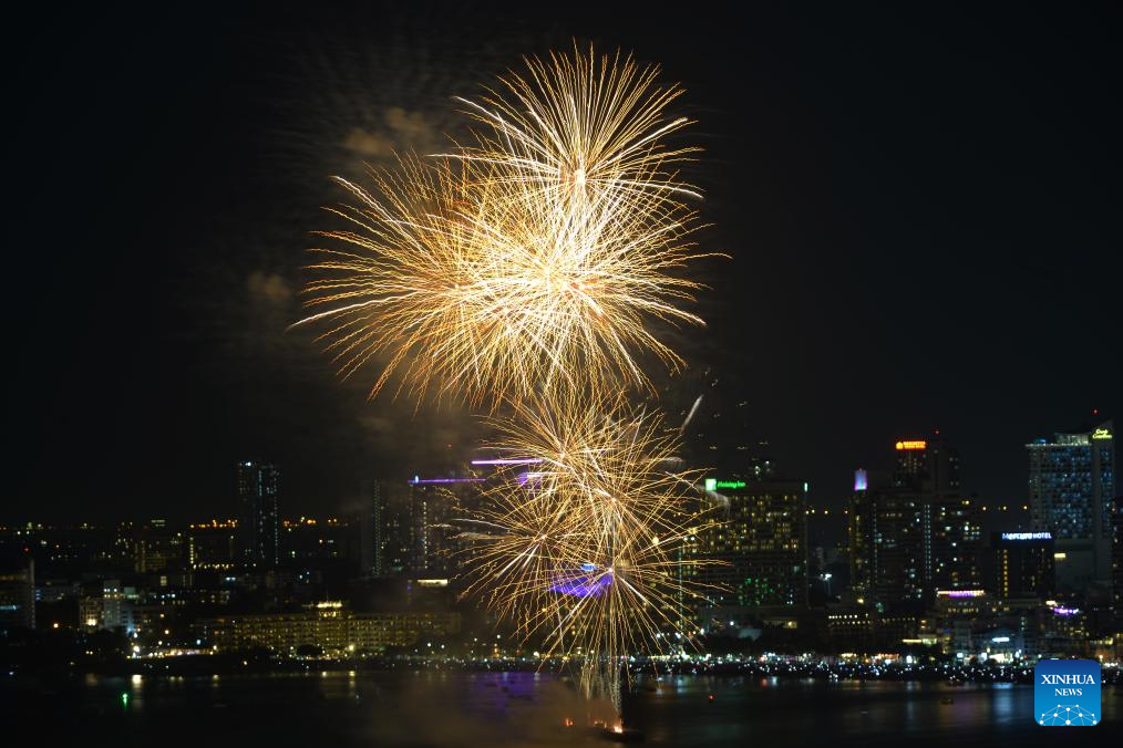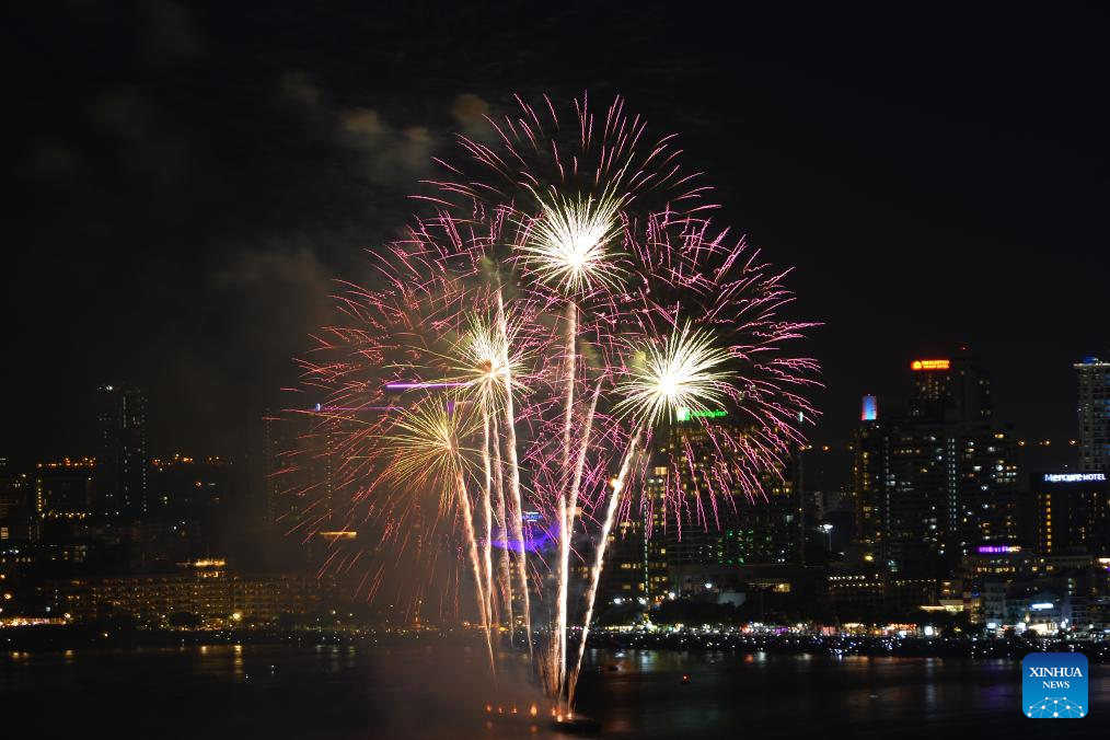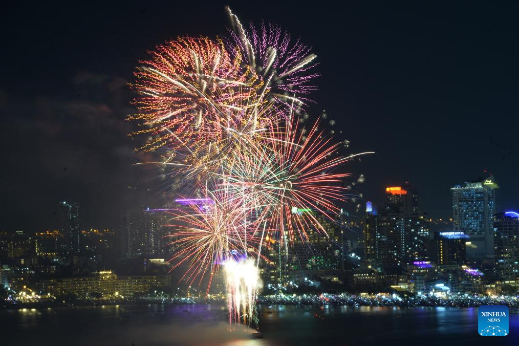 A fireworks display is seen in Pattaya, Thailand, Nov. 24, 2023. With tens of thousands of tourists and local residents gathering on the beach and enjoying the festive vibes, a spectacular fireworks display lit up the night sky in Pattaya on Friday. (Xinhua/Rachen Sageamsak)