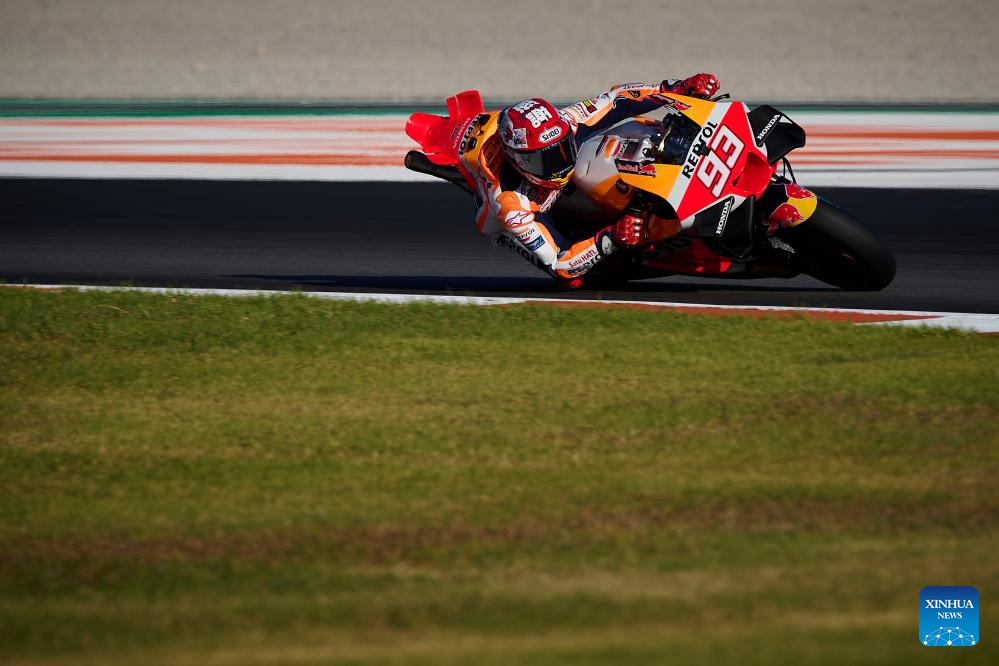 Marc Marquez of Respol Honda Team competes during the Sprint race of the Valencia MotoGP at Ricardo Tormo Circuit, in Valencia, Spain, on Nov. 25, 2023. (Str/Xinhua)