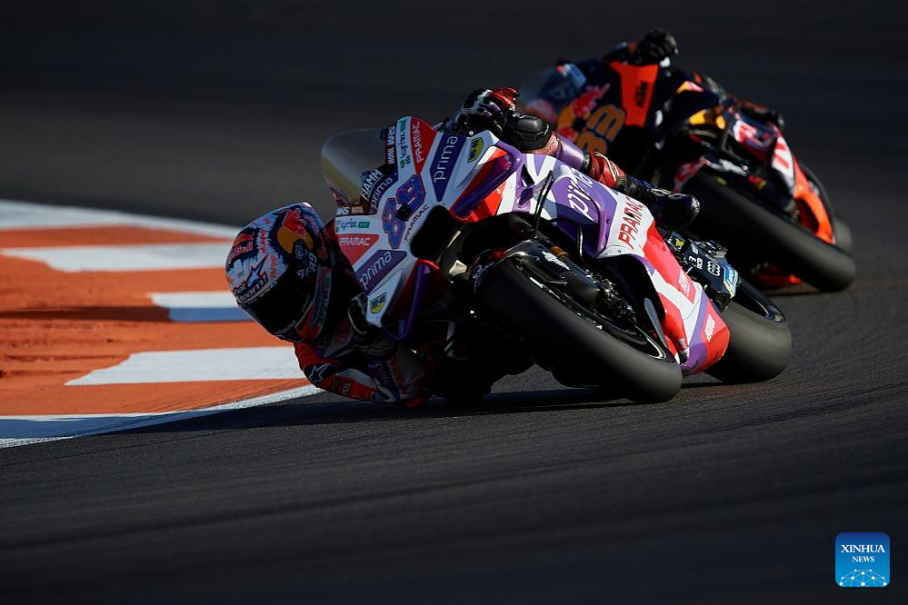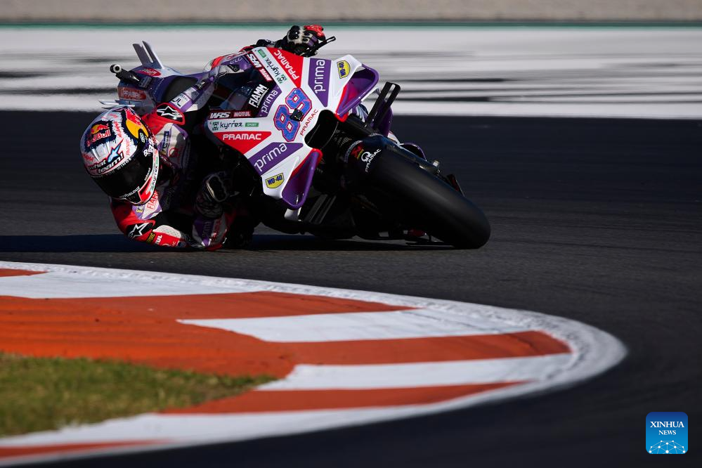 Jorge Martin of Primac Pramac Racing competes during the Sprint race of the Valencia MotoGP at Ricardo Tormo Circuit, in Valencia, Spain, on Nov. 25, 2023. (Str/Xinhua)