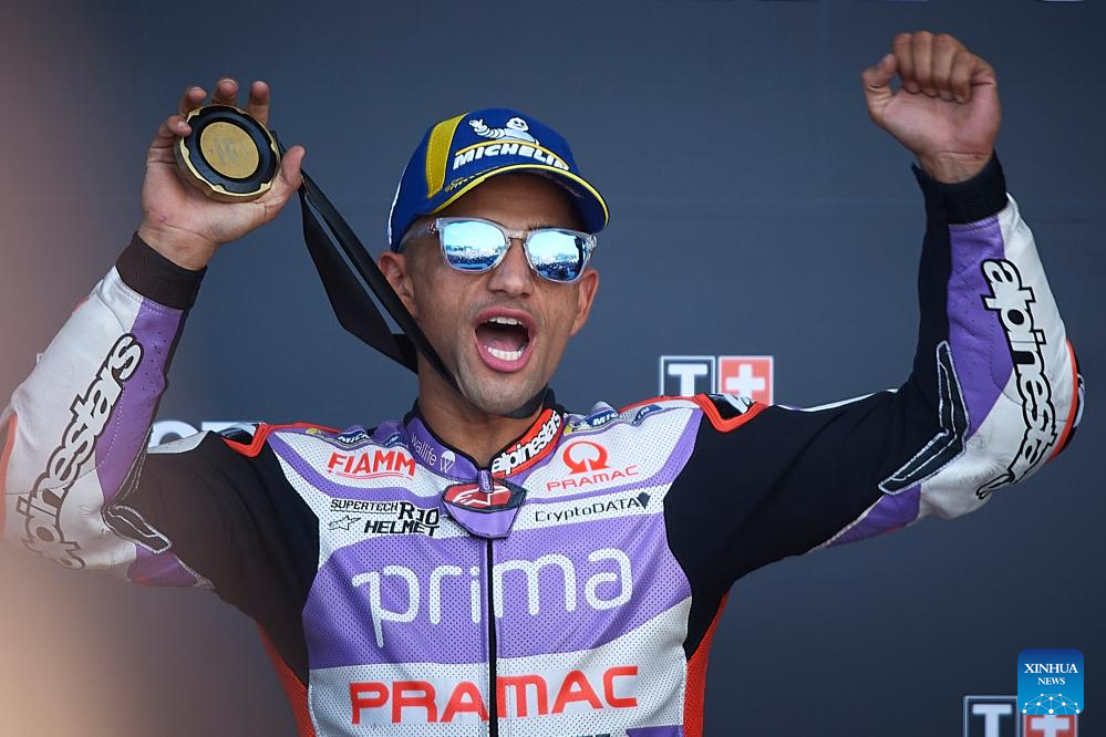 Jorge Martin of Primac Pramac Racing celebrates during the award ceremony for the Sprint race of the Valencia MotoGP at Ricardo Tormo Circuit, in Valencia, Spain, on Nov. 25, 2023. (Str/Xinhua)