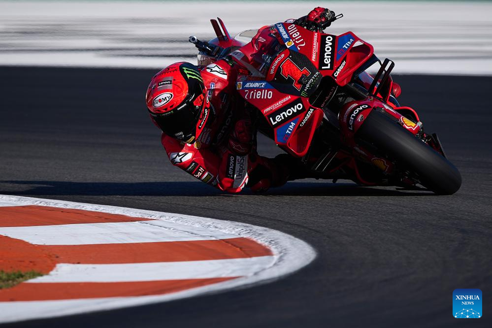 Francesco Bagnaia of Ducati Lenovo Team competes during the Sprint race of the Valencia MotoGP at Ricardo Tormo Circuit, in Valencia, Spain, on Nov. 25, 2023. (Str/Xinhua)