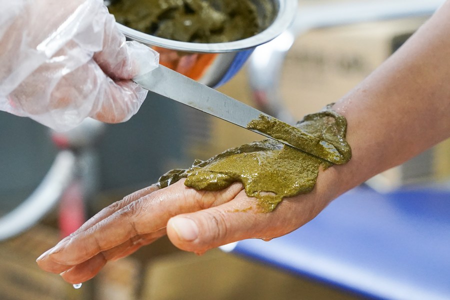 A staff member spreads ointment on the hand of a snakebite victim at Qimen Institute of Snakebite in Qimen County of Huangshan City, east China's Anhui Province, Nov. 8, 2023. (Xinhua/Du Yu)