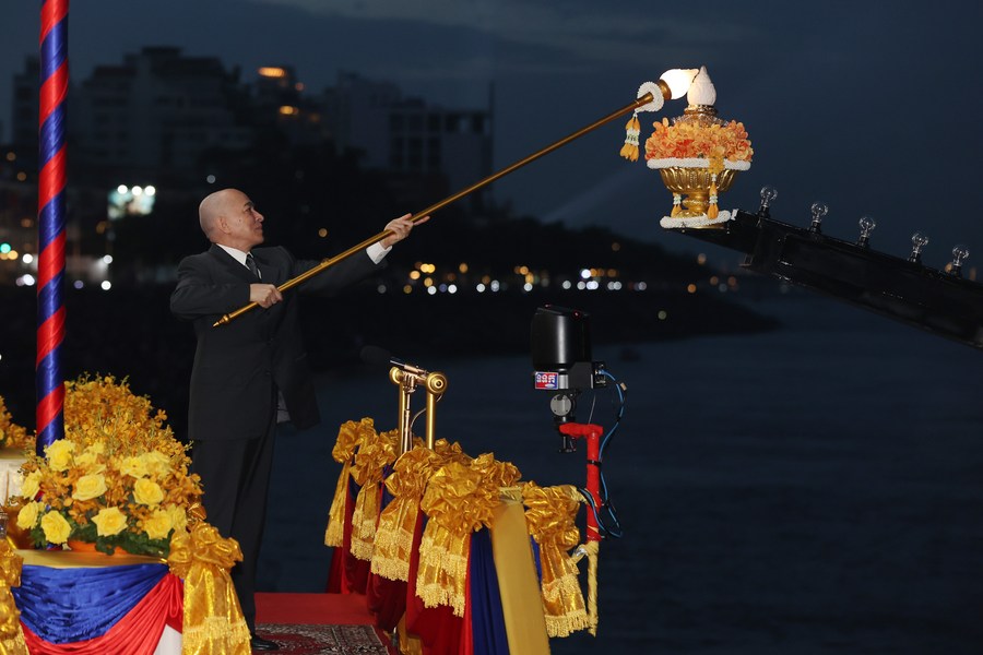 Cambodian King Norodom Sihamoni symbolically turns on the light of illuminated floats during the Water Festival in Phnom Penh, Cambodia, Nov. 26, 2023. (Photo by Sovannara/Xinhua)