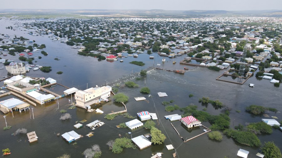 This aerial photo shows a view of flood-hit Beledweyne, central Somalia, Nov. 20, 2023. (Photo by Abdullah Boyow/Xinhua)